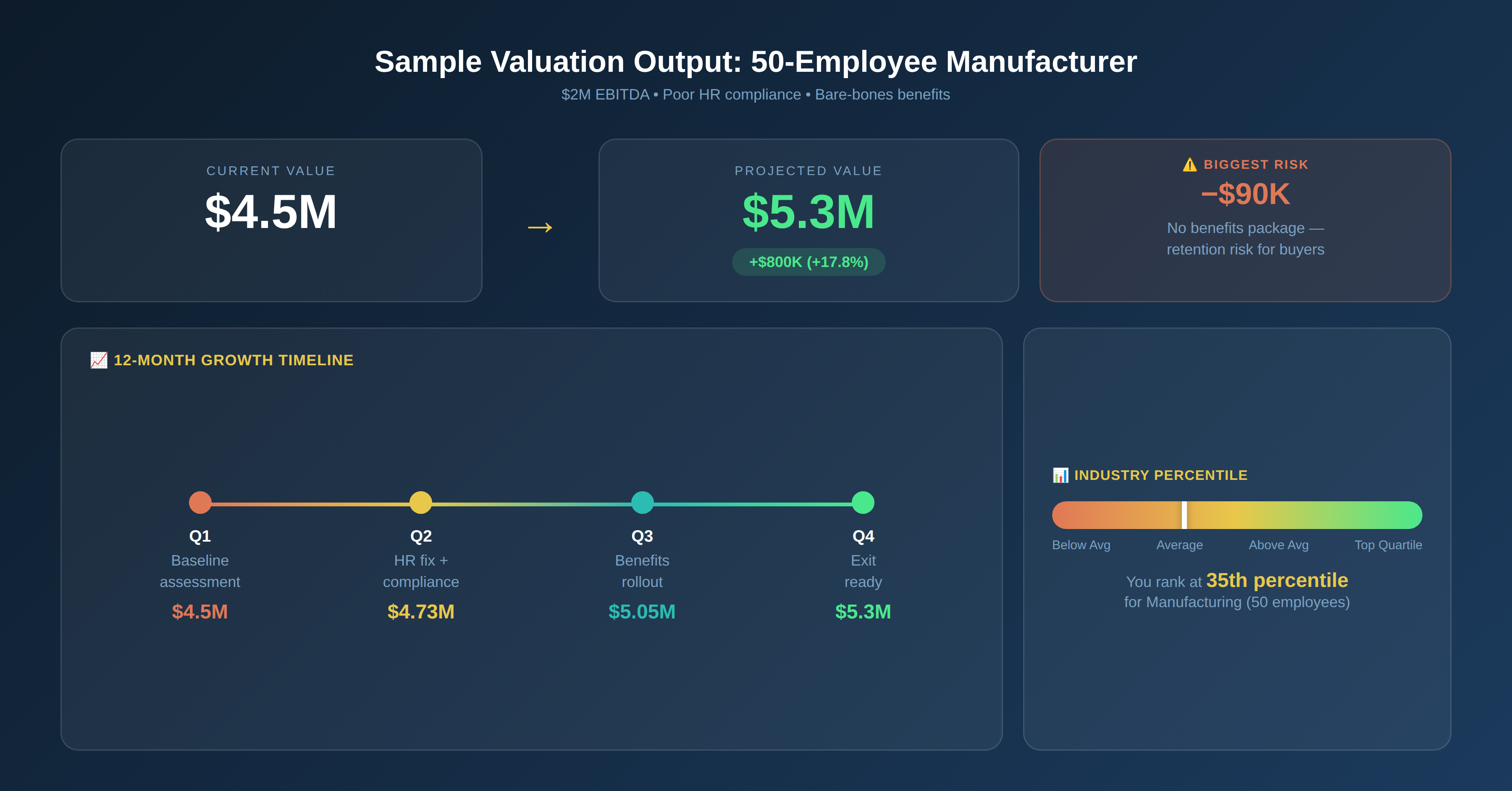 Sample output for a 50-employee manufacturer with $2M EBITDA: current value $4.5M, projected value $5.3M after fixing HR and benefits gaps — an $800,000 opportunity.