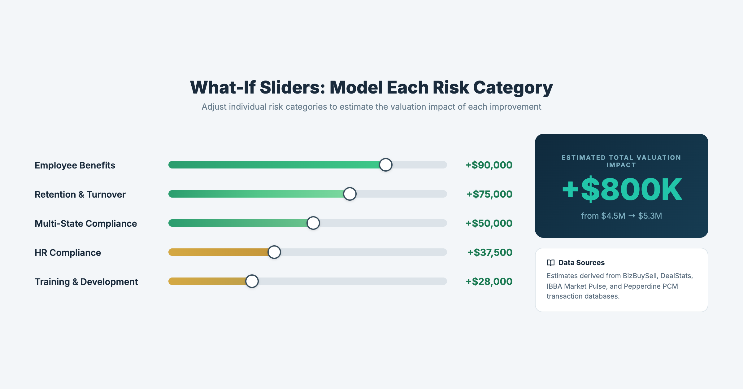 The tool scores ten workforce-related risk categories and benchmarks each against four national transaction databases. It then estimates the gap between a company's current valuation multiple and the multiple that could apply if identified issues were addressed before a sale.